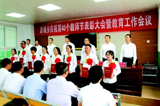 清水县新城乡日前召开第40个教师节庆祝表彰大会暨教育工作会议。乡党委、政府班子成员,12个村党支部书记、新城乡中学、学区、幼儿园部分教师等共计80余人参加了会议。会上,对一年来全乡优秀教师、优秀班主任、优秀教育工作者、先进学校和支持教育家庭、先进村、先进单位进行了表彰,5名优秀代表分别作了交流发言。 刘少华 摄