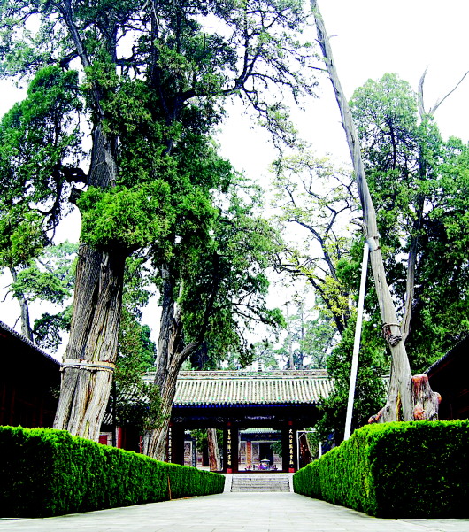 □ 伍振 丝绸之路西入甘肃,第一个重镇就是著名的中国历史文化名城——天水。 天水是我国神话传说时代的“三皇五帝”中伏羲、女娲、黄帝的故乡,因此即使是在现代,一进入天水地界,一路上铺天盖地而来的标牌都写着“弘扬伏羲文化 传承中华文明”“凝聚全球华人 打造祭祖圣地”……天水市区高速路口处写有“弘扬伏羲文化 打造祭祖圣地”的标牌更是显赫。记录八千年前的文明 天水市位于甘肃省东南部,地处陕、甘、川三省交界,东接关中,南临巴蜀,西倚甘南,北扼陇坻,是甘肃省第二大城市,是陇东南地区的政治、经济、文化中心。 天水有史可稽的建城史有2700多年。这座千年古城的一砖一瓦上,停留着时间流淌过的痕迹,岁月的长河荡涤着这座城市,留下了太多古旧、龟裂的遗址……天水秦安县境内的大地湾遗址,是距今4800年至7800年的新石器时代古村落遗址,这里有中国最早的原始地画、最早的“混凝土”地面和宫殿,亦有中国最早的旱作农作物标本、中国最早的彩陶及中国文字最早的雏形,其规模之大、内涵之丰富,在全国考古史上实属罕见,为孕育中华文明作出不朽贡献。 作为实物依据,大地湾不仅复原了华夏先祖在混沌初启时的生活场景,还给《山海经》里女娲补天和唐代司马贞《史记索隐》中关于伏羲创世的历史寻找到了实物依据。伏羲城的文化徜徉 走进青石铺地的伏羲城,像是走进了明朝,这里不仅有分列两旁的仿古建筑,更有参天古树,为古城增添了一丝沧桑。 伏羲城内最有特色的便是大理石铺就的民俗文化步行街,两旁的庑殿式商店里经营着文创、纪念品等。远远望去,这片明代的古建筑群,因着灰色的琉璃瓦、朱色的墙壁显得气势宏伟。 伏羲城民俗文化一条街的中央便是伏羲庙,当地百姓俗称“人祖庙”,为纪念上古“三皇之首”伏羲氏而建造。据史载,伏羲庙创建于明代,后经历代修缮形成现在的规模。庙前的大幅太极图案,只有凌空俯视才能一览它的全貌。站在太极图案中心放眼望去,伏羲庙肃穆、庄严。伏羲庙正大门前有个古戏台,古戏台前面是新修的伏羲广场。游人不多时,伏羲庙便只开一个偏门供游人进出。庙宇内和街道外形成鲜明的反差,仿佛只一步就能让人从繁华迈入幽静。古树大殿铭刻沧桑 徜徉在伏羲庙,目光不时被一株株苍劲高大的古树深深吸引,这些挺拔的古树,便是这座城市悠久历史的见证。 在天水人眼中,伏羲庙的古柏就如同伏羲爷一般,是有灵性的。据说,伏羲庙创建时在庙宇各院内种植了64株古柏,象征着伏羲六十四卦之数,历经几百年的风雨,现存37株,被称为伏羲卦柏。其中,有一棵千年古柏,树身已经严重倾斜、开裂,但它顶部的枝叶依然挺拔繁茂。伏羲庙大门内侧东西墙角原有两株相对而立的古槐,现存东边一株,树干中空,经鉴定为唐代所植,这不禁令人想起“千年柏,万年松,不如老槐空一空”的谚语来。 沿着青砖路向里走,是一个大门,上面写着“龙祖”二字。院内左右有碑亭,正中靠北是月台,“先天殿”就建在月台上,高大而雄伟。殿宇重檐琉璃瓦顶,饰螭首,顶上平脊两端有翘转向内的鸱尾。圆窗透花,刻有二龙一珠,障水板刻松鹿图,雕刻精绝,别具一格。 天水老百姓经常以一种很自豪的口吻对人说,天水的伏羲庙是目前我国保存最完整、年代最早的祭祀伏羲的建筑群。而静坐于先天殿的“伏羲”,则是全国最大的明代伏羲塑像。其身披树叶,俨然一副原始部落首领的模样,他朴素的形象,完全呈现出了人类最初的样子。祭祀伏羲之礼 我国祭祀伏羲之礼世代绵延,经久不衰。作为伏羲文化诞生地的天水,民祭伏羲的习俗亦是由来已久。每年春、秋两次,民间相传农历正月十六为伏羲诞辰,实为春祭;农历七月十九相传为伏羲去世的时间,则举行秋祭。天水对这位人文始祖的祭祀相当重视,一年两次的民祭伏羲活动,都会以庙会活动形式在伏羲庙举行。这里也多次举办公祭伏羲大典和伏羲文化旅游节,吸引海内外各界人士前来伏羲庙寻根祭祖。 2005年开始,公祭伏羲大典由甘肃省人民政府主办,时间选在每年公历的6月22日,因为这一天是夏至,是北半球白昼最长的一天。现在,每年一届的公祭伏羲大典,已成为海内外华人寻根祭祖的盛会,成为甘肃省独具特色的重要文化品牌。2006年,“太昊伏羲祭典”正式被国务院列入首批国家级非物质文化遗产名录。■ 伏羲庙参天古树■ 大地湾原始村落遗址