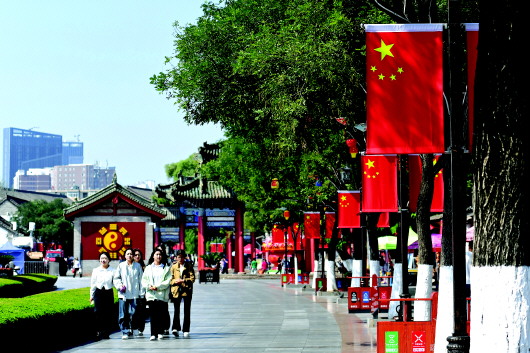 9月23日,天水伏羲城五星红旗迎风招展。 国庆节临近,秦州区在城区各条街道和伏羲城、天水古城悬挂起五星红旗。过街天桥上“热烈庆祝中华人民共和国成立75周年”的横幅引人注目;精心布置的花坛景观吸引市民驻足拍照……天水处处洋溢着喜庆祥和的国庆氛围。 新天水·天水日报记者 孙镇 摄