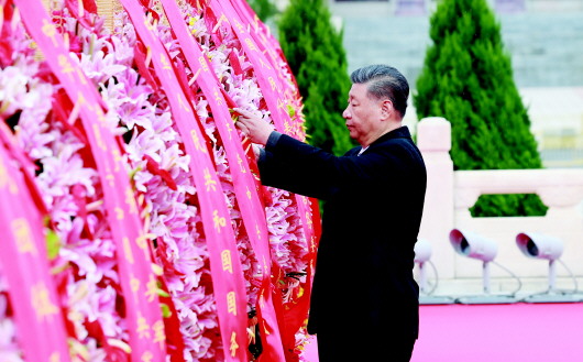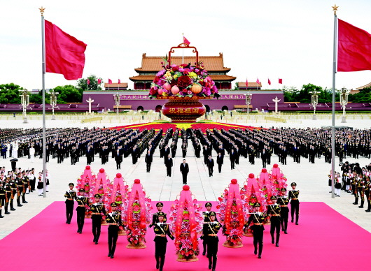 新华社北京9月30日电 在庆祝中华人民共和国成立75周年之际,烈士纪念日向人民英雄敬献花篮仪式30日上午在北京天安门广场隆重举行。党和国家领导人习近平、李强、赵乐际、王沪宁、蔡奇、丁薛祥、李希、韩正等,同各界代表一起出席仪式。 壮阔的天安门广场上,鲜艳的五星红旗迎风招展。广场中央,“祝福祖国”巨型花篮表达着对祖国繁荣昌盛的美好祝福。巍然耸立的人民英雄纪念碑北侧,两组花坛上镶嵌着白菊等鲜花组成的18个花环,寄托着全体中华儿女对英烈的深切缅怀。 临近10时,习近平、李强、赵乐际、王沪宁、蔡奇、丁薛祥、李希、韩正等党和国家领导人来到天安门广场,出席向人民英雄敬献花篮仪式。 纪念碑前,2400多名各界代表手持鲜花,列队肃立。他们中有耄耋之年的老战士、老同志,有胸前佩戴着红飘带的烈士亲属,有国家勋章和国家荣誉称号获得者代表,有受表彰的民族团结进步模范代表,有朝气蓬勃的青年学生和少年儿童。 中国人民解放军军乐团小号手吹响《烈士纪念日号角》。深沉而嘹亮的号声,将人们的记忆带回风云激荡的历史岁月。 “礼兵就位!”随着号令,三军仪仗兵迈着铿锵有力的步伐,正步行进到纪念碑前持枪伫立。 10时整,向人民英雄敬献花篮仪式正式开始。军乐团奏响《义勇军进行曲》,全场齐声高唱中华人民共和国国歌。 国歌唱毕,全场肃立,向为中国人民解放事业和共和国建设事业英勇献身的烈士默哀。 默哀毕,手持鲜花的少年儿童面向人民英雄纪念碑高唱《我们是共产主义接班人》,并致少年先锋队队礼。 方阵前,以中共中央,全国人大常委会,国务院,全国政协,中央军委,各民主党派、全国工商联和无党派爱国人士,各人民团体和各界群众,老战士、老同志和烈士亲属,中国少年先锋队名义敬献的9个大型花篮一字排开,花篮红色缎带上书写的“人民英雄永垂不朽”格外醒目。 军乐团奏响深情的《献花曲》,18名礼兵稳稳抬起花篮,缓步走向人民英雄纪念碑,将花篮摆放在纪念碑基座上。 习近平等党和国家领导人登上纪念碑基座,在花篮前驻足凝视。鲜艳的红掌、盛放的百合、轻盈的文心兰,寄托着对人民英雄的无尽思念和崇高敬意。 习近平迈步上前,仔细整理花篮缎带。随后,习近平等党和国家领导人缓步绕行,瞻仰人民英雄纪念碑。 党的十八大以来,在以习近平同志为核心的党中央坚强领导下,全党全军全国各族人民团结一心、砥砺奋进、守正创新,推动党和国家各项事业取得历史性成就、发生历史性变革,开创新时代中国特色社会主义事业崭新局面。 (下转第二版)(上接第一版)迈上新征程,14亿多中国人民赓续英烈精神、汲取奋进力量,正意气风发以进一步全面深化改革奋力谱写时代新篇,为以中国式现代化全面推进强国建设、民族复兴伟业而不懈奋斗。 少年儿童和各界群众代表也依次走到纪念碑前,献上手中鲜花并瞻仰纪念碑。 敬献花篮仪式由中共中央政治局委员、北京市委书记尹力主持。 在京中共中央政治局委员、中央书记处书记,全国人大常委会副委员长,国务委员,最高人民法院院长,最高人民检察院检察长,全国政协副主席和中央军委委员出席仪式。 中央党政军群有关部门和北京市主要负责同志,各民主党派中央、全国工商联负责人和无党派人士代表,在京老战士、老同志和烈士亲属代表,功勋荣誉获得者代表,全国少数民族参观团成员,首都各界群众代表等参加了仪式。 9月30日上午,党和国家领导人习近平、李强、赵乐际、王沪宁、蔡奇、丁薛祥、李希、韩正等来到北京天安门广场,出席烈士纪念日向人民英雄敬献花篮仪式。这是习近平整理花篮上的缎带。 新华社记者 王晔 摄 9月30日上午,党和国家领导人习近平、李强、赵乐际、王沪宁、蔡奇、丁薛祥、李希、韩正等来到北京天安门广场,出席烈士纪念日向人民英雄敬献花篮仪式。 新华社记者 谢环驰 摄