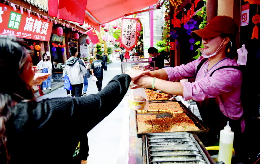 国庆假期,天水伏羲庙和天水古城成为热门旅游目的地,吸引了全国各地的游客前来参观。来自洛阳的郑先生告诉记者:“我刚到天水,第一站就选择了伏羲庙。以前听说过伏羲的传说,来到这里,更感受到了伏羲文化的深厚与博大。天水作为中国历史文化名城,值得来一趟。”游客们在伏羲庙拜祖谒庙、选购文创产品,在这里开启国庆之旅。 国庆假期的天水古城,五星红旗招展,游人络绎不绝。品美食、逛老街,体验老天水的古风古韵。西安游客靖先生说:“出了伏羲庙,走进天水古城,特意品尝了天水麻辣烫,百闻不如一吃,鲜香麻辣,天水麻辣烫名不虚传。”古城里经营甜食的刘毅告诉记者:“国庆假期的销量比平时要好得多,外地游客很喜欢天水传统美食,呱呱、面皮和特色甜食深受外地游客欢迎。” 新天水·天水日报记者 孙镇 摄