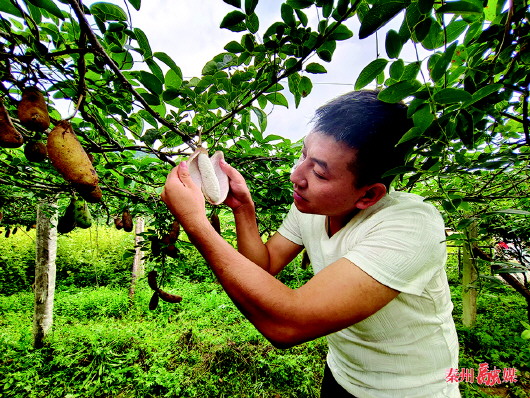 本报讯 金秋时节,秦州区娘娘坝镇花园村返乡青年张会军种植的八月瓜进入采收期。张会军利用昔日荒山,种出了药用价值和市场价值很高的八月瓜。如今,八月瓜陆续上市,成为当地村民致富增收的“金瓜瓜”。 在张会军的秦州区花园种养殖农民专业合作社八月瓜种植基地,翠绿的藤蔓上挂满了丰硕的瓜果,一个个形态弯曲的果实,憨态可掬。成熟的八月瓜呈淡紫色,表皮裂开一道口子,露出雪白晶莹的果肉,散发出阵阵清香。张会军正忙着给顾客称重、装袋,脸上洋溢着丰收的喜悦。 “今年的总产量下来能达到2万多斤到3万斤,现在挂果的已经20余亩了。”张会军说。 八月瓜,中药名预知子,含有丰富的营养价值和药用价值。因其外形似香蕉,口感润滑香甜,又被称为野香蕉。果壳自然裂开后,雪白的果肉清香甘甜。除了直接食用之外,八月瓜浑身都是宝。 “八月瓜皮里面的花青素,包括维生素、氨基酸含量比较高,成熟果皮提取的物质能做美容护肤品。果子到八成熟,中间有个白线的时候,把它采摘下来,整个果皮加果肉里面的籽,切除烘干,可以做果茶。”张会军说。 八月瓜原是一种生长在山林灌木丛的野果,但因自然条件下挂果量相对较少,因此市面上并不多见。2016年,回乡创业的张会军瞄准了这一产业,在自家的田地试种了八月瓜。几年来,经过张会军不断摸索试验和精心培育,今年八月瓜大面积结果。 为了让八月瓜的品质达到最优,张会军一边选取最优品种育苗扩大种植面积,一边跑销路联系客商。如今,成熟的八月瓜吸引了很多周边群众前来采摘购买。 昔日长在荒山上的野果子,摇身变成了张会军增收的“致富果”。张会军说,由于管理到位,今年八月瓜长势很好,迎来了丰收,每斤能卖8元到10元不等,明年将进入盛果期,亩产可以达到4千斤到5千斤。现在每天都有村民前来咨询八月瓜的种植方法。 “现在种植技术已经很成熟了,全国各地的销路也已经打通,最远的我们能发到广州、上海等地。我想带着周边的农民,一起把种植八月瓜做成一个大的产业,带着老百姓一起赚钱。”张会军说。 (李欣 高世飞)