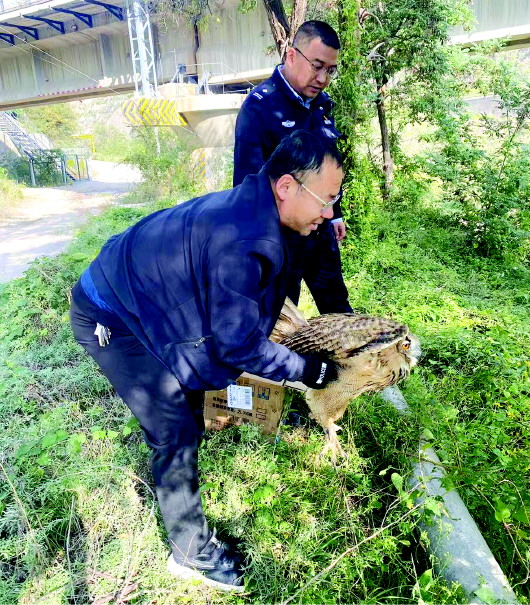 本报讯【新天水·天水日报记者蔚军平】甘谷县公安局日前联合甘谷县林业和草原局救助了一只国家二级保护动物——雕鸮,并将其顺利放归大自然。 近日,甘谷县公安局森林警察大队民警接到群众报警求助,在大像山镇水上公园发现了一只野生动物。接警后,森林警察大队民警立即启动野生动物救助应急预案,联系甘谷县林业和草原局前往配合处置。 民警和县林业和草原局工作人员到达现场后,对其进行了仔细辨认,确认属于国家二级保护动物,名为雕鸮(猫头鹰)。通过现场检查,这只雕鸮身体状况良好,无外伤,活动情况也良好,具有野外生存能力,符合放生条件。于是,民警将其带至野外放归大自然。