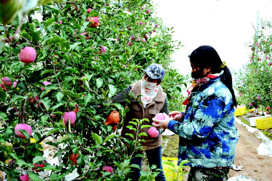 乡村行 看振兴 □新天水·天水日报记者 张彬霞 赵军霞 10月14日,在甘谷县磐安镇张家沟村的京东农场里,负责人张见林种植的富士苹果喜获丰收,成熟的苹果红彤彤的挂满枝头。张见林正带领工人忙着采摘,从枝头摘下苹果,用园艺剪小心地剪掉果蒂,轻轻放进果筐里,运输车再集中将苹果送往集中点进行统一分拣,保证果实新鲜,品质高端。 京东农场地处磐安镇金川片区万亩苹果示范基地,农场占地面积1000余亩,涉及张家沟、尉家沟、东卜峪3个村,苹果种植主要以富士系列为主,有阿珍、雪里红、福布拉斯、维拉斯黄金等10多个品种,都已进入挂果期。 “这里土层深厚,气候温润,光照充足,特殊的自然地域优势最适宜苹果种植。”当天,该农场技术顾问李强强对记者说,平时在果园中,工人们对园艺、水肥、植保等方面都做到精细化管理,对果树均能做到精准检测,今年实施的防雹网建设项目,也为苹果丰产搭建了坚实的屏障。 自10月以来,富士苹果进入采摘期。“今年富士苹果迎来丰收年,农场里3年挂果期的果树亩产6000斤左右,商品果占比在85%以上,预定价每斤5.8-6.2元之间,预计今年产值达1500万元左右。”张见林高兴地对记者说。 张见林表示,眼下是富士苹果的销售旺季。自富士苹果采摘以来,农场通过直播带货、网站平台销售等线上方式,每天向全国各地发送苹果1000箱以上,同时线下走量也非常可观,每两天会发送5吨富士苹果,主要送往深圳、嘉兴等各地的市场,线上和线下销售情况都很乐观。从目前采摘情况来看,预计采摘期还要持续1个月。 为了做大做强苹果产业链条,张见林表示,农场在持续做好线上线下销售的同时,下一步计划生产苹果干、苹果醋、苹果酒等苹果深加工产品,有效提升苹果产业的附加值。 近年来,磐安镇通过万亩苹果示范基地的带动,以黑膜覆盖、有机肥代替化肥、化肥减量增效为主的土壤管理技术,以简化修剪、高光效树形为主的树体管理技术等“四项技术”得到了广泛应用。目前,共创建绿色标准化示范基地1.5万亩,提质增效近3万亩,建成京东农场智慧果园300亩,建成果园防雹网1380亩,开展苹果保险累计2.8万亩。 磐安镇副镇长廖永钢告诉记者,磐安镇党委、镇政府高度重视产业发展,在全镇下大力气打造了金川片区万亩苹果示范基地,预计今年产量达12万吨左右、产值5.8亿元,亩均产量2600公斤、产值1.23万元,随着果品产业的发展,有效带动了周边群众的就业增收。