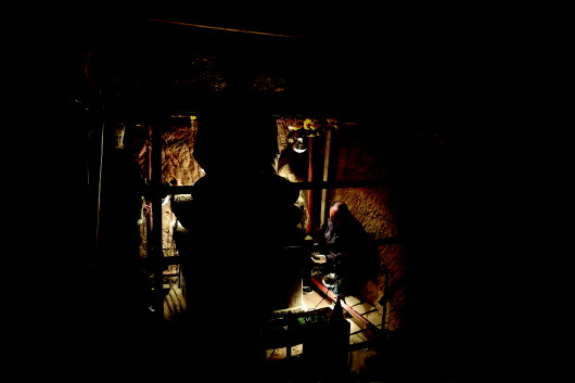 ▲麦积山石窟艺术研究所保护研究室文物修复师牟常有(右)和何举在麦积山石窟133窟内修复塑像