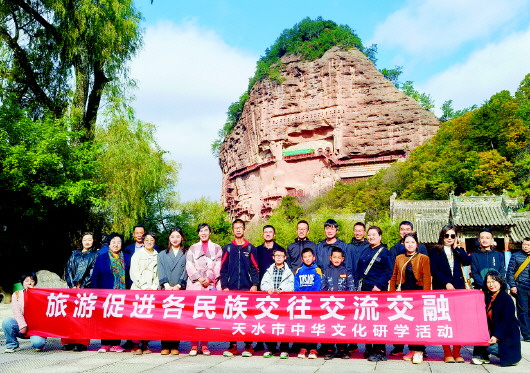近日,我市举办旅游促进各民族交往交流交融暨中华文化研学交流活动。 本次活动由市民族宗教事务委员会主办,研学团一行先后来到麦积山石窟、伏羲庙、天水古城、大像山和水帘洞等主要景区景点进行了参观交流,在亲身体验中感受博大精深的中华历史文化,增强各族群众对伟大祖国、中华民族、中国共产党、中国特色社会主义的认同,不断铸牢中华民族共同体意识,厚植“中华民族一家亲”理念。 新天水·天水日报记者 张彬霞 摄