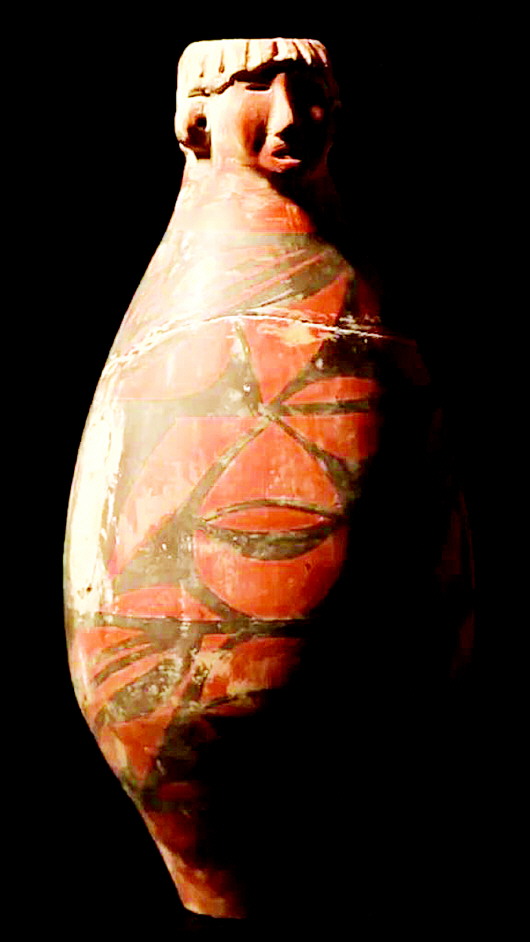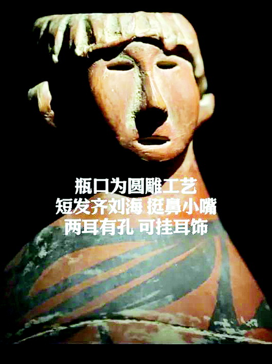 □ 多蕾 刘阳 人头形器口彩陶瓶1973年出土于甘肃省秦安县五营镇邵店村,是马家窑文化前期的彩陶。 人头形器口彩陶瓶高32.3厘米,口径4厘米,底径6.8厘米,口做圆雕人头像,短发齐刘海,挺鼻小嘴,两耳各有一孔,用于佩戴耳饰,腹以上施淡红色陶衣。瓶身上的图案为变体的鸟纹和茎叶纹,是对当时人们渔猎生活的反映。 微微隆起的瓶身像极了怀孕女性的腹部,象征着生命永生不息的轮回。陶瓶集制陶、彩绘、雕塑艺术于一身,是一件既具实用性又具有艺术性的古代艺术品。 (据新华社)