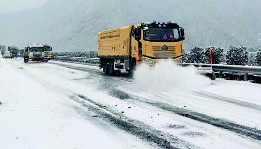 12月9日,我市大范围降雪,天水公路事业发展中心高速公路养护所第一时间组织人员、机械上路,采取人歇机不歇的方式开展梯队式除雪防滑作业,在急弯陡坡、临山背阴和隧道进出口等易结冰积雪路段多频次撒布融雪剂,保障高速公路安全畅通。 新天水·天水日报通讯员 苏婷婷 摄