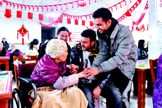 12月17日,天水师范学院留学生川柏(中)和穆肖(右)拉着天水市秦州区综合社会福利中心老年护理院老人的手开心地聊天。 当日,天水师范学院商学院50余名师生到秦州区综合社会福利中心老年护理院,为老人们送上了一场精彩的文艺演出。来自也门共和国的两位留学生特别登台,为老人们表演了精彩的花式踢毽子节目,瞬间点燃了现场氛围,赢得阵阵掌声。留学生穆肖表示:“尊老爱老是中华民族的传统美德,身为留学于这片土地的学子,我们虽来自异国他乡,但也深受触动,希望在年关之时,用实际行动表达对老人们的敬意与祝福,亲身感受并融入中国传统文化之中。” 新天水·天水日报记者 周文涛 张彬霞 摄