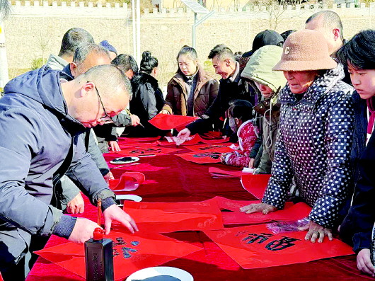 本报讯 春节将至,为弘扬中华优秀传统文化,营造喜庆祥和的节日氛围,1月15日,甘谷县文化馆在安远镇政府和安远镇西城村同步开展了“联‘语’新岁——我们的节日·春节”送福送春联活动,以文化惠民之举,为乡村带来新春的温暖与祝福。 活动现场热闹非凡,处处洋溢着浓浓的年味。文化馆的书法老师和书法爱好者齐聚一堂,他们挥毫泼墨,笔走龙蛇,行书、楷书、隶书等字体各展风采。一个个“福”字饱满圆润,寓意吉祥;一副副春联对仗工整,饱含着对新春的美好期许。除了春联,现场还为群众赠送了书画作品,这些作品主题多样,用艺术的笔触描绘了美好生活。 当日,前来领取春联和书画作品的群众络绎不绝,大家有序排队,脸上洋溢着喜悦的笑容。一位大爷拿着刚写好的春联高兴地说:“手写的春联才有年味,感谢文化馆给我们送来这么好的新春礼物!”此次活动不仅将节日的祝福送到了群众手中,还在丰富乡村精神文化生活的同时,让大家感受到了传统文化的魅力。 (王林录)