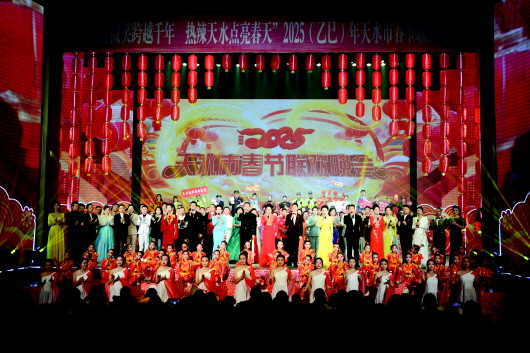 本报讯【新天水·天水日报记者李欣桐】金龙呈祥辞旧岁,银蛇献瑞迎新春。1月25日晚,“东方微笑跨越千年 热辣天水点亮春天”2025(乙巳)年天水市春节联欢晚会在秦州大剧院精彩上演,为全市人民带来了一场精彩纷呈、年味浓郁的新春文化盛宴。 晚会在开场舞《锦绣天水万里春》中拉开帷幕,欢快的鼓点奏响了春天的旋律,优美的舞步舞出了喜庆的气息。随后,非遗展演《鼓舞天水》点燃了现场气氛,秦安莲花战鼓、武山旋鼓、清水轩辕鼓及清水木人摔跤接连上演,演员们热情高涨、鼓声激昂,舞出了天水人民的豪迈和喜悦。舞蹈节目《十里桃林春意暖》《水天一色》《启航新征程》精彩纷呈,舞者们用精湛的舞技、优美的舞姿,传递着新年的喜庆与祝福。 整台晚会新意盎然、异彩纷呈。小品《就在这里吃》,演员用幽默诙谐的天水方言和精湛的表演技巧,引得台下观众笑声连连、掌声不断;秦腔《苏蕙观灯》将传统戏曲元素与现代舞台技术相结合,呈现出别具一格的视听效果;情景歌舞《东方微笑》、张家川歌舞《花儿唱响幸福来》及器乐合奏《丝路新语》让人目不暇接;歌曲联唱《欢欢喜喜过大年》《天水欢迎你》《说伏羲》《中华吉祥果》唱出了新年的美好祝福和天水人民的热情。此外,天水文旅推荐官的加盟,更是为晚会增添了很多互动性和趣味性。 “这次春晚精心准备了两个月的时间,主要突出‘天水麻辣烫’这个主题,我们围绕天水的各个元素进行节目的创排和筛选,也有两区五县的一些节目融入此次晚会,我们希望用一道独具匠心、暖意融融的文化大餐向全市人民送上新年的美好祝愿。”晚会执行导演陈晓杰接受记者采访时说。 此次晚会由市委宣传部、市文化和旅游局主办,市融媒体中心、市歌舞艺术研究中心承办。晚会不仅是一场艺术的盛宴,更是天水人民精神风貌的生动展示。为了让更多观众能够实时观看这场文化盛宴,晚会还通过天水市融媒体中心新天水客户端,“天水融媒”视频号、快手号,“TSTV直播天水”抖音号进行了现场直播。