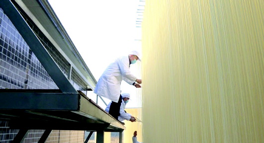 □新天水·天水日报记者 侯亚龙 曹润彬 在天水,说起传统手工挂面,大家一定能想到麦积区石佛镇黄家庄的手工挂面。近日,在浓浓年味里,记者走进麦积区石佛镇黄庄村手工挂面制作非遗传承人黄新勇的挂面制作间,一股浓郁的面香味迎面飘来,黄新勇夫妇正忙着对已经揉搓好的粗面条进行撑拉。 “制作一把手工挂面,需要26道工序才能完成。”黄新勇告诉记者,他们家制作的手工挂面原材料选用优质高筋面粉,要经过和面、醒面、揉面、压面、开条、捋条、搓条、盘条、上杆、抻面、上架、拉长、分面等多道工序,少一道都不行,该出的力也一点都不能省,只有这样,做出的手工挂面才能麦香浓郁、口感筋道爽滑、耐煮不糊。 晾晒架上,细如银丝的挂面如同瀑布一般倾泻而下,稍稍用力一扯,弹性十足。 手工挂面,这个历经岁月淬炼不断传承和发展的传统产业,依靠淳朴的手工技艺代代相传,其健康天然、口感爽滑的优良品质不仅深受消费者的喜爱,更成为了远离故土的游子心中最难忘的家乡味道。 顾客陈鹏斌说:“常年在外地生活,就想着咱们家乡的一把挂面,好不容易回家一趟,想带点手工挂面回去,让朋友们也尝一尝咱们家乡的味道。” “我们的挂面不仅深受当地人的青睐,很多外地游客也专门来购买,订单量逐年增加,今年春节接了不少订单,现在正在加紧制作。”黄新勇高兴地说。 黄新勇从小在父亲的言传身教下,对手工挂面技艺情有独钟,退伍后便子承父业,将原来家中的老作坊改造成了干净卫生的加工企业,并成立了天水双河食品有限责任公司,注册了以“天绣源”为品牌的三阳川黄家庄挂面。同时,黄新勇通过不断创新,积极传授技艺,带出了数十位能工巧匠,不仅为当地人解决了一部分就业,还使这一传统的手工挂面制作技艺得到了传承弘扬。 丝丝挂面无声地“晒”着黄家庄村村民们的幸福生活。 “作为非遗传承人,我要把我们黄家庄手工挂面更好地传承下去,把老一辈的智慧和手艺传承下去,带动更多人就业致富,让我们的‘天绣源’手工挂面走出天水,迈向全国。”黄新勇信心百倍地说。