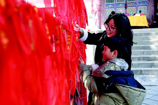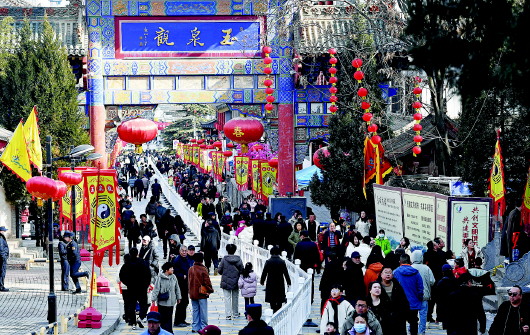 2月5日,农历正月初八,天水市民相约结伴登上秦州区玉泉观,系红绳、摸香炉、猜灯谜、祈福纳祥,玉泉观“上九会”热闹喜庆。 “上九朝观”是天水人春节期间必不可少的年俗,每年正月初八、初九两天都有数以万计的民众“朝观祈福”。今年“上九会”游园时间为2月5日(农历正月初八)8时至2月6日(农历正月初九)20时,期间实行单行道游园路线。 新天水·天水日报记者 孙镇 摄