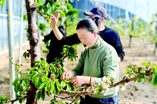 新天水·天水日报记者 宗禾 人勤春来早,农事正当时。初春时节,走进麦积区中滩镇设施樱桃示范园,只见雪白娇艳的樱桃花竞相开放,为人们送来早春的气息。果农则穿梭于花丛中间,忙着疏花、授粉,一派热闹忙碌景象。 初春乍暖还寒,但大棚内花开繁盛,果农们三两人一组,对着樱桃树枝进行疏花、摘除部分花瓣,同时对第一遍授粉情况进行筛查,以便更高效地开展后续授粉工作。 “授粉的好坏直接关系到樱桃的产量和品质,所以趁最近天气晴好、樱桃花开正盛,必须抓紧时间进行授粉工作。暖棚现在已经完成第一遍授粉,工人现在正在进行疏花工作,再过五六天就能做第二遍授粉了。”管理员李怀民说,“现在我们棚干活的工人有20到30个,等露天授粉开始以后人员可能还要增加。” 疏花工作完成后,即可开始授粉,果农们立即配置药水,开始第一轮授粉后的补授工作。只见果农们轻柔托举起花朵,小心翼翼地将配好的花粉水喷到樱桃花蕊上,沾染药水的花瓣变得娇柔粉嫩。 “年过完第一时间我们就进行花期授粉,然后疏花,这几天主要是对前期没有授上粉的花蕊进行补授。”在园内干活的村民刘芸桂说,“今年大棚里面暖和,棚外天气也好,花开得特别早,所以今年疏花、授粉工作都比往年早进行一些。” 据了解,麦积区中滩镇产业园共建成设施樱桃大棚25座60亩,栽植露地樱桃100亩,配套水肥一体化滴管系统、温湿度自动化调控系统、集雨水池、樱桃预冷保鲜库等。主要引进俄罗斯八号、美早、桑提拉等13个新优大樱桃品种,选用2—3年生优质大树建园,实现“一年栽植、二年见果、三年丰产”的目标。 “现在暖棚基本授粉结束,马上冷棚就要开始第一轮授粉。我们的暖棚樱桃比冷棚樱桃要早上市20天到半个月时间,预计在四月初暖棚樱桃就可以上市,冷棚樱桃要到四月中旬至五月才大量上市。”李怀民说道。