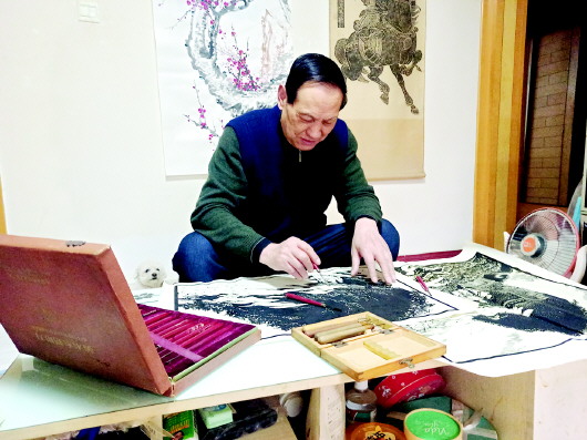 □新天水·天水日报记者 徐媛 春节前夕,一场名为“版魅绽华——天水木版画专题展”的展览,于天水民俗博物馆开展。在文博热持续升温的当下,这个散发着浓郁陇右风情的艺术展,成为市民游客体验文化年俗的热门之选。漫步展厅,一幅幅古朴稚拙、充满乡土气息的木刻版画次第排开,鲜活的天水年俗画卷在墨香朱彩间流转。其中,出自中国版画家协会甘肃分会理事、市文化馆退休干部常国宣之手的30幅充满地道烟火气的木刻版画,如同永不褪色的时光胶片,记录着天水的山水、民俗与记忆。 于是,一个阳光明媚的午后,记者在常国宣的讲述中,走近了他,以及他的艺术之旅。 “我最早接触的艺术是国画,启蒙老师是山西省夏县文化馆的吕世芳。”坐在记者对面,常国宣一边喝着手中的茶,一边回忆起自己的艺术之路,“那时候大约15岁,纯粹是因为对美术的喜爱和兴趣,开始跟着吕老师学习画画。”他的声音温和而坚定,仿佛在讲述一个久远的故事。 常国宣的艺术之路并非一帆风顺,他没有接受过学院派的系统教育,而是自学成才。他曾在电影院从事过广告海报绘画工作,并将艺术融入大型海报绘制中,展现出快速而自由的艺术表达能力。“那时候,我每天骑着三轮车写横幅标语,有时甚至忘了去学校上课。”他笑着说,眼神里透着一丝顽皮。 而真正让常国宣与木刻版画结缘的,是在遇到晓岗老师之后。 24岁那年,常国宣在画友田致宏介绍下,结识了著名版画家晓岗。“晓岗是西安美院的高才生,后来成为甘肃省美协副主席,他的作品以木刻版画见长。”常国宣回忆道,“当时晓岗老师来天水出差,宾馆登记了都不住,就住在我家。晚上,他常常给我讲解版画的知识,从理论到实操,手把手一点一滴地教我。”正是在晓岗老师的指导下,常国宣完成了他的第一幅木刻版画作品《巍巍麦积山》,这幅作品不仅展现了天水麦积山的壮丽景色,也奠定了常国宣木刻版画的独特风格。 “木刻版画的核心在于‘木味’和‘刀位’。”常国宣边回忆,边为记者解释,“木头有它的质感,刀有刀的力度,两者结合才能呈现出独特的艺术效果。”透过常国宣的木刻版画作品,记者发现他的木刻版画更注重刀法的变化,追求大起大落的效果。他对记者说:“我这个人有点像草原上的马,不喜欢约束,喜欢自由,这一点也很好地体现在了我的艺术创作中。我喜欢通过刀法的变化,来表现画面的细节和情感,而不是一味追求平直的线条。” 因此,从常国宣的木刻手法中,很容易就能窥见他的独特之处:既有传统的韵味,又融入了现代的创新。尤其是他自制的勾刀,更是让他的作品充满了个性。“刻版的过程中,我发现没有现成的工具能够满足我的创作需求,于是便自己动手制作了一把能够勾回的勾刀。”常国宣说,自从有了自制的勾刀,他的木刻版画创作更加得心应手,刀下的线条也更为流畅而有力。 生活是艺术的源泉,和所有艺术家一样,常国宣的创作灵感也来自他身边的点滴生活,来自他所热爱的天水。 “我最早刻的作品主要是以天水地区的景点为主题,比如南郭寺、麦积山、仙人崖、李广墓等。我想把天水的美,通过木刻版画的形式,展现给更多的人。”常国宣的一幅以南郭寺为题材的作品中,细致刻画了天水20世纪70年代“人拉车子驴在外”的景象,该作品画面构图巧妙,阴阳结合,充满了诗意与韵味,仿佛在诉说着那渐已远去的故事。 “在刻这幅作品时,我特意采用了‘留黑’手法,从而让木刻版画特有的色彩艺术效果得以完美呈现。”常国宣说,他希望通过这幅作品,让观众感受到天水独特的民俗文化。 仔细欣赏常国宣的每一幅木刻版画作品,那不仅仅是艺术的创作,更是他对生活的热爱和对天水的眷恋。每一幅作品都承载着他的情感和记忆,仿佛在诉说着一个个动人的故事。 即便后来作品曾在国内外展览中获奖,也曾被国家指定的收藏机构收藏,但常国宣坦言,最初他却并不那么喜欢木刻版画。他说:“说实话,我开始对木刻版画并不了解,也不感兴趣,但后来在老师的引导下逐渐产生兴趣,并在实践中慢慢爱上了这一艺术形式。最痴迷的时候,吃饭都顾不上,家里满地、满床刻的都是木头屑,惹得家人意见很大……” 回溯常国宣的艺术之路,自称“杂家”的他,除了木刻版画之外,还涉猎摄影、国画、磨漆画等多个艺术领域,但不论是木刻版画、摄影、国画或磨漆画,奇怪的是,他每涉足一个艺术领域,却“能异乎寻常地出人意料,能诸其形而见其果,能获得省级,甚至国家级奖项……”记者觉得,这与他一直奉行的“行万里路,读万卷书”的艺术理念是分不开的。为了精进自己的版画技艺,他曾在东北拜访过杜鸿年,在四川拜访过吴强年,学习他们的刀法特点,并融入自己的创作中。“学别人生,像别人死。我主张学习别人的东西要形成自己的风格,不能生硬模仿。”常国宣说,“要在保持个人特色的同时,借鉴吸收他人的艺术精华。”足够努力、足够坚持、懂得钻研,这或许就是青少年时代就做艺术梦的常国宣,被称为“怪杰”的原因吧。 再次踏进展厅,凝视着那一幅幅古朴的木刻版画,记者仿佛听到了一声声刻版的声响。那声音仿佛从心灵深处传来,满是对艺术的热爱和对生活的执着,而这种执着与热爱,又何尝不是常国宣本人的真实写照呢?