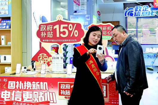 2月27日,市民在秦州区家电和手机卖场选购家用电器和手机产品。自国家实施手机、平板、智能手表(手环)购新补贴和家电以旧换新工作以来,我市相关部门加大宣传力度,多措并举开展促消费活动,激发市民消费活力,提升市场消费热度。 新天水·天水日报记者 孙镇 摄