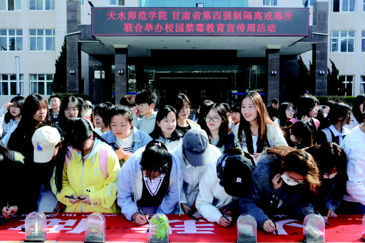 近日,由天水师范学院、甘肃省第四强制隔离戒毒所联合开展的“筑牢禁毒防线 守护平安校园”——大学生禁毒宣传及预防毒品犯罪教育活动启动仪式在天水师范学院举行。活动旨在加强普通高等学校毒品预防教育工作,强化高校师生“珍爱生命、远离毒品”的意识,不断提升师生识毒、防毒、拒毒的能力。 新天水·天水日报记者 蔚军平 摄