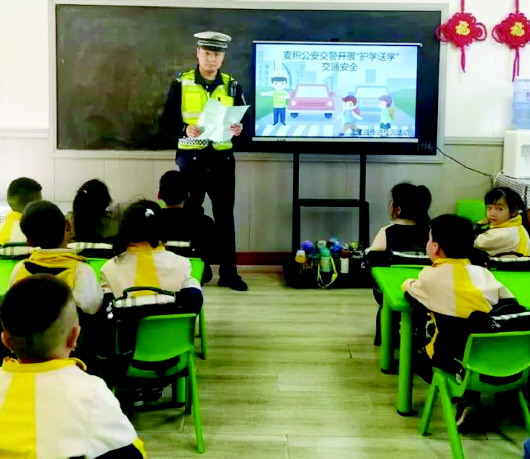 近日,麦积公安交警走进甘泉镇玉兰幼儿园开展“护学送学”交通安全主题宣传活动,加强幼儿对交通安全知识的了解,提升其交通安全意识和自我防护能力,预防和减少道路交通事故的发生。 新天水·天水日报记者 蔚军平 摄