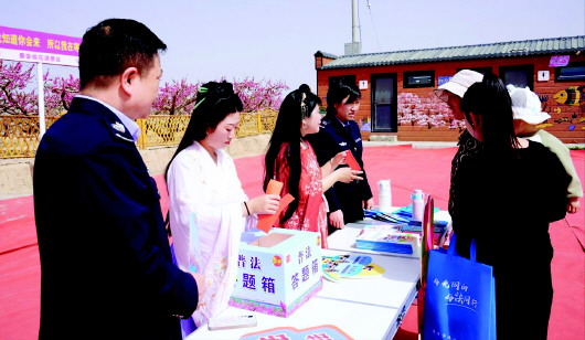 近日,秦安县万亩桃园迎春绽放,吸引了众多游客纷至沓来。秦安县司法局以花为“媒”,创新开展“普法进景区”宣传活动,让游客在赏花游玩的同时接受法治文化的熏陶。 石少磊 摄