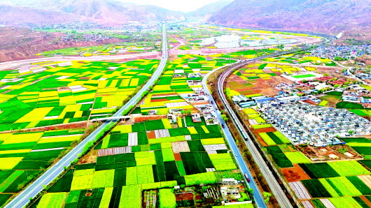 谷雨时节,一场喜雨过后,武山县鸳鸯镇榜沙河沿岸的油菜花开得愈发绚烂,这明亮的金黄与村庄、河流、青绿的麦苗构成了一幅色彩斑斓的绝美田园风光图,像极了油画家笔下的人间仙境,有农人三两忙碌其中,有游人散客漫步观光。从鸳鸯镇出发,沿310国道一路西行,不多时,便可到桦林镇,渭河水浇灌的大地上,满是生长着的“春的希望”,热烈的油菜花肆意“流淌”,铺满了河谷川地,耀着人的眼。陇海铁路、连霍高速和310国道穿梭其中,更显出勃勃生机,大自然精心绘制的色块,铺展成这绝美的自然诗章。暮春的武山大地,因着这油菜花的烂漫,奏成了一首缤纷绚烂的田园交响曲、一幅色泽明艳的乡野画卷。 王正平 赵超 摄