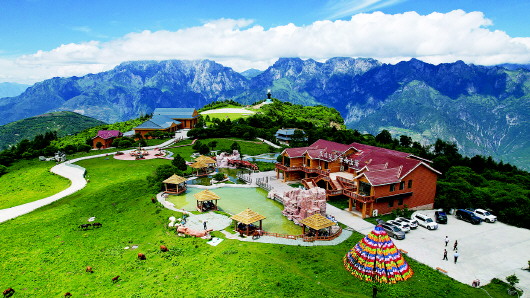 游客在舟曲拉尕山一处特色民宿外游览(7月12日摄,无人机照片)。 今年以来,甘肃省甘南藏族自治州舟曲县深入推动文旅融合发展,促进融合业态提质升级,从当地藏族女子“以花为簪”的古老习俗中取名,积极打造一百多公里的“簪花之路”风景廊道,依托拉尕山、白龙江、博峪藏寨花谷、茶马古道遗址等特色旅游资源,将自然风光、历史文化与民族风情深度融合,使生态资源转化为发展资本,带动沿线村落的民宿客栈、非遗工坊、休闲农业等业态发展,全面激活文旅发展新动能。 新华社记者 陈斌 摄