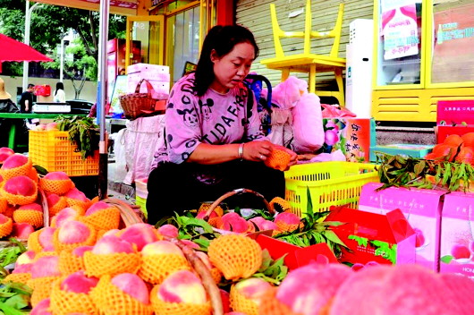 秦安县中熟蜜桃“仓方早生”上市,7月14日商贩正在分拣装箱蜜桃。 近年来,秦安县以“特色农业+乡村振兴”为抓手,不仅改良蜜桃品种、推广科学种植技术,还通过“线上直播”拓宽销售渠道,一步步把“好果子”变成“好牌子”,让秦安蜜桃成了金字招牌。 刘荣华 摄