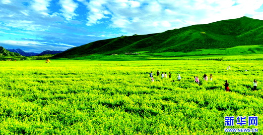 连日来,位于祁连山下的甘肃省张掖市民乐县扁都口景区万亩油菜进入盛花期。金黄的油菜花海与草原绿野相连,空气中弥漫的淡淡花香,酝酿山川,醉了游人。 新华网发(王将 摄)