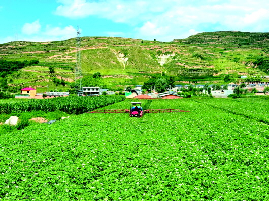 马阗雪 盛夏七月,骄阳似火。樊河水流经的张家川回族自治县恭门镇,千亩马铃薯田迎来盛花期,粉紫色的小花缀满枝头,随风摇曳成浪漫花海。与此同时,一台台拖拉机载着喷雾设备穿梭其间,细密的药雾在花丛中弥散——这是当地农户抢抓农时,为马铃薯控旺杀菌的关键管护场景,也是恭门镇种薯产业提质增效的生动注脚。 近年来,按照全县“4+2”现代产业体系布局,恭门镇以持续建设农业产业大镇为目标,依托耕地面积大,樊河水系丰富,雨水充沛的特色优势,在镇域布局冬小麦、饲料玉米、马铃薯、中药材、设施蔬菜、蛋鸡养殖等6个高效农业种植养殖示范基地。 走进镇上的水肥一体化高标准绿色原种基地,400亩田垄整齐如织,马铃薯花虽小却开得热烈。定西农夫薯园马铃薯种植专业合作社的农机手孙海正驾驶拖拉机驶过,专门用于农药喷洒的喷雾设备好似一台滑翔机,双臂展开足足有13.2米。 田埂旁,农户李巧玲正仔细检查叶片长势:“往年这时候得蹲在地里手动掐尖控旺,现在机器喷药又匀又快,一亩地能省大半天工夫。”她脚下的滴灌带正缓缓渗水,水肥通过管道直达根系,与空中的农药喷洒形成“上下协同”的管护网络,这是基地“绿色种植”的标配。 在盛花期这一关键时期,孙海每天都要喷洒60—100亩马铃薯田。位于梁湾村、毛山村的2000亩一级种薯扩繁基地,规模化优势更显突出,机械化作业不仅效率高,农药用量也更少,更避免了人工操作的误差,为种薯品质上了“双保险”。 产业兴则就业旺。在这片薯田里,家门口务工成了常态。用恭门镇副镇长马勇的话来说,就是“群众从种到收实现了全过程参与。”从早春播种时的机械操作辅助,到花期的管护巡查,再到秋收时的分拣包装,全年有200名左右村民在此稳定务工。不仅如此,村民们从过去只会传统种植的“庄稼汉”变身掌握现代化种植技术的“种植能手”,在增加务工收入的同时学习种植本领,种薯产业让土地成了农民致富的“聚宝盆”。 夕阳下,随着最后一台拖拉机驶出基地,田埂上,结束作业的农户和技术员讨论着下一步的管护要点,笑声与花香一同在田野间荡漾。从种到收的全链条机械化、标准化生产,不仅让恭门镇的种薯有了“科技范”,更让乡亲们的腰包鼓了起来,在乡村振兴的道路上,踏出了坚实而有力的步伐。