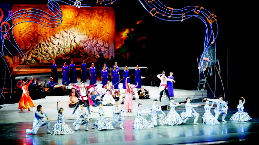 日前,第七届中国新疆国际民族舞蹈节在乌鲁木齐等地火热开展,新疆艺术剧院木卡姆艺术团精心打造的歌剧《木卡姆恋歌——万桐书》精彩上演。 新疆木卡姆艺术集歌、舞、乐于一体,演员舞姿或刚劲有力,或热闹欢愉,带领观众进入欢乐海洋。 图为演员在表演歌剧《木卡姆恋歌——万桐书》。 新华社记者 张啸诚 摄