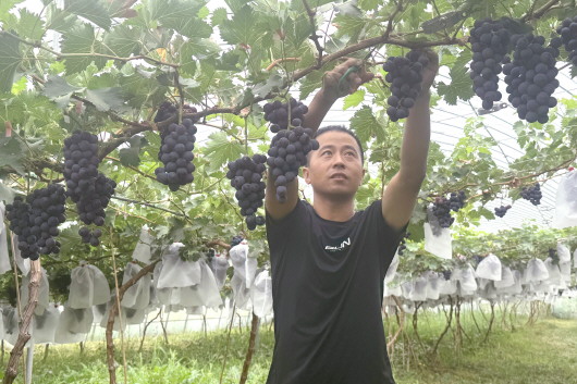 本报讯【新天水·天水日报记者李旺旺 崔柏漩】夏秋之交,正是瓜果丰收的好时节。麦积区的早熟葡萄已进入成熟期,正陆续抢“鲜”上市,一串串饱满的葡萄果香四溢,提前给市民带来了“舌尖上的甜蜜”。 8月6日一大早,走进麦积区马跑泉镇潘集寨村千亩葡萄种植基地内,一排排整齐有序的葡萄架的藤蔓间挂满了沉甸甸的果实。村民潘雄穿梭其中,正忙着采收葡萄。他手握剪刀,拨开纸袋一角,仔细查看每串葡萄的成色,将颗粒饱满的葡萄剪下,有序装筐,抢先上市销售。潘雄边剪葡萄边说:“我们家种植葡萄六亩,每亩产量三四千斤,今年葡萄口感和品质比往年好,一年产值六七万元,收益还是很可观的。” 随着早熟葡萄的陆续成熟和上市,不仅为市民提供了更加丰富的水果选择,也为当地农民带来了实实在在的经济效益。在麦积区马跑泉镇潘集寨村千亩葡萄种植基地旁,果农们沿路支起了小摊,不少市民驱车赶来选购新鲜葡萄。 在天水市麦积区国家科技特派团葡萄产业示范基地早蔬种植专业合作社,只见一座座温室大棚矗立在阳光下,棚内阳光玫瑰、妮娜皇后、蓝宝石、蜜光等不同品种的葡萄缀满藤蔓,合作社负责人葛彦兵穿梭在葡萄架间查看葡萄长势。 “目前上市的是蜜光葡萄,亩产大概2000斤左右。我们整个园区是256亩,今年的产量预计能达到20万斤,产值预计500万元左右。”葛彦兵说。 目前,全市葡萄种植面积3.24万亩,主要集中在麦积区,2025年预计产量达到6.5万吨以上,产值实现3.5亿元。近五年全市引进发展以阳光玫瑰为主的葡萄新优品种10多个,促进了天水葡萄产业的健康发展,为当地群众铺就了一条香甜四溢的富民路。