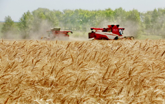 8月7日,位于黑龙江省五大连池市的大庆油田农场调动多台联合收割机抢收小麦。 近日,“北大仓”黑龙江省小麦陆续进入成熟期。部分小麦种植区利用晴好天气,开展小麦抢收工作,大型收割机在麦田里来回穿梭,田间地头呈现出繁忙有序的丰收景象。 新华社发(陆文祥 摄)