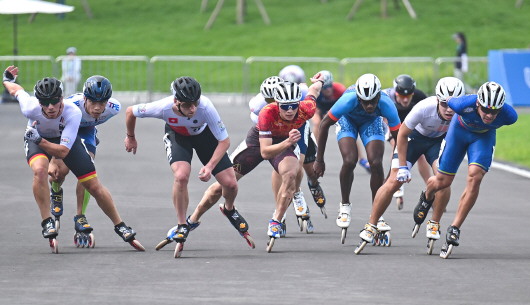 8月12日,参赛选手在比赛中。当日,在成都世运会速度轮滑公路赛男子公路赛(10000米积分)决赛中,西班牙队选手佩乌拉夺冠,巴拉圭队选手米雷纳和法国队选手费里分获亚军和季军。 新华社记者 谢剑飞 摄