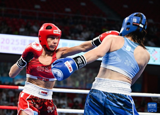 8月14日,乌克兰选手伊万诺娃(左)与土耳其选手阿齐兹奥卢在比赛中。当日,在2025年成都世运会自由搏击女子K1 52公斤级铜牌赛中,乌克兰选手伊万诺娃战胜土耳其选手阿齐兹奥卢,获得铜牌。 新华社记者 张博文 摄