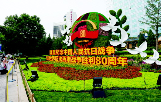 据北京市园林绿化局介绍,纪念活动期间,在长安街沿线以“铭记历史、缅怀先烈、珍爱和平、开创未来”为主题,从建国门至复兴门布置10组立体花坛,生动展现80年来伟大的中国人民前仆后继、不屈不挠、顽强奋斗,为实现强国建设、民族复兴伟业而不懈努力的伟大精神。 新华社记者 鞠焕宗 摄