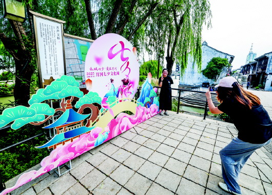 8月27日,游客在嘉兴市南湖区月河历史街区的七夕主题展板前拍照打卡。