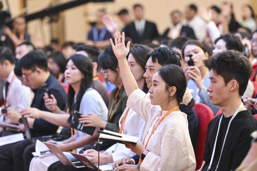 9月2日上午,中国人民抗日战争暨世界反法西斯战争胜利80周年纪念活动新闻中心举办第三场记者见面会,日本籍八路军老战士小林清之子小林阳吉,法国医生贝熙叶之子贝石涛,苏联元帅瓦·伊·崔可夫之孙尼·弗·崔可夫,美中航空遗产基金会主席杰弗里·格林,英国友人大卫·柯鲁克、伊莎白·柯鲁克之子柯马凯等为中国抗战胜利作出贡献的国际友人或其遗属代表介绍对中国人民抗日战争的认识等方面情况,并回答记者提问。这是记者举手提问。