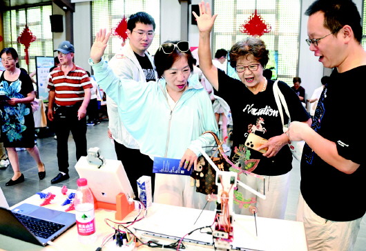 9月17日,上海市浦东新区周家渡街道社区居民在“全国科普月”科技创新成果展活动现场参与体验。