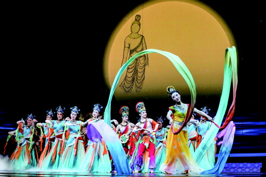 9月20日晚,演员在敦煌大剧院表演新版《丝路花雨》。