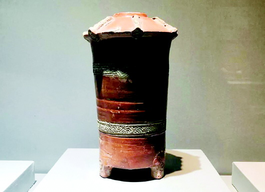 收藏于张家川县博物馆的这件汉代陶仓,顶部呈伞状,圆筒身,底部有三足,整体施釉。从这件陶仓的器型大小和规格判断,该陶仓应该是随葬的明器,不是真正存放粮食的实用仓。陶仓作为明器,最早发现于春秋战国时期的秦墓中,出土地主要集中在秦人活动的关中地区。