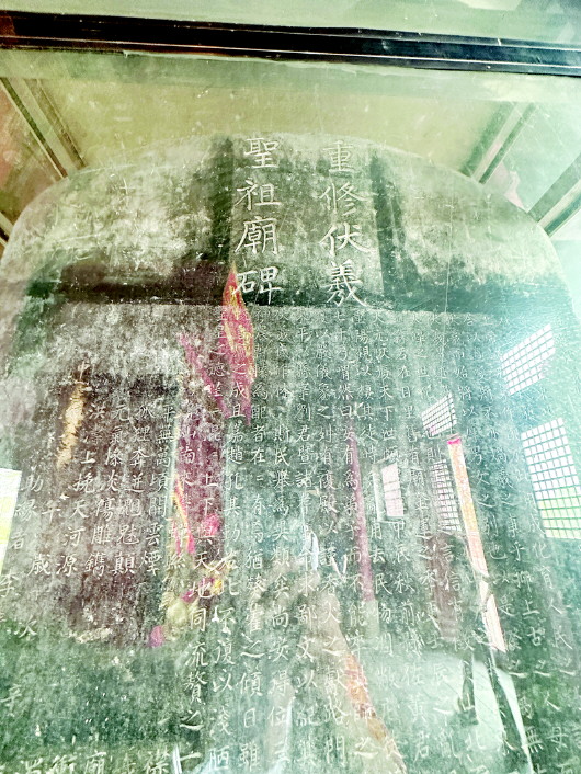 走进庙门,典型的宋代四梁八柱大殿巍峨矗立在伏羲陵台之上。飞檐斗拱间,尽显古朴雄浑,每一根梁柱、每一处雕刻都凝聚着千年前的建筑智慧与匠心传承。大殿内,人首蛇身的伏羲塑像庄严肃穆,目光深邃坚定,仿佛穿越千年时光,凝视着华夏文明的绵延不绝,目光中饱含对人类起源的思索、对天地万物的洞察以及对子孙后代的期许。伏羲塑像右侧,一通元代《重修伏羲圣祖庙碑》格外引人注目。黄艳生将大家聚拢在一起,讲解得更为起劲,他神采飞扬地说:“这通立于蒙古中统二年(公元1261年)的石碑,历经七百多年风雨,字迹虽已模糊,却承载着厚重的历史。在蒙宋对峙时期,蒙汉两族官员共同监督重修庙宇,彰显了伏羲文化跨越民族的强大凝聚力,昭示着中华文明多元一体的发展脉络,是中华民族团结融合的生动见证。”