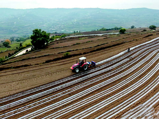 近日,在张家川回族自治县梁山镇的万亩高山小麦良种繁育基地,五台机械同时作业,覆膜机往来穿梭,一条条地膜如游龙般铺展于山谷之间。据悉,今年全县冬小麦计划播种面积20.4万亩,目前已完成98%。