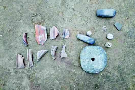 该遗址分布于村庄覆盖的一级台地至山顶台地,东西长约700米,南北宽约300米。核心区位于二级台地,地表散落大量陶片、石器及玉料,文化层厚度达1.2—2.5米,暴露白灰面房址、红烧土遗迹等关键遗存。
