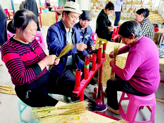 高粱笤帚加工产业园里工人们正忙着扎制笤帚(资料照片)