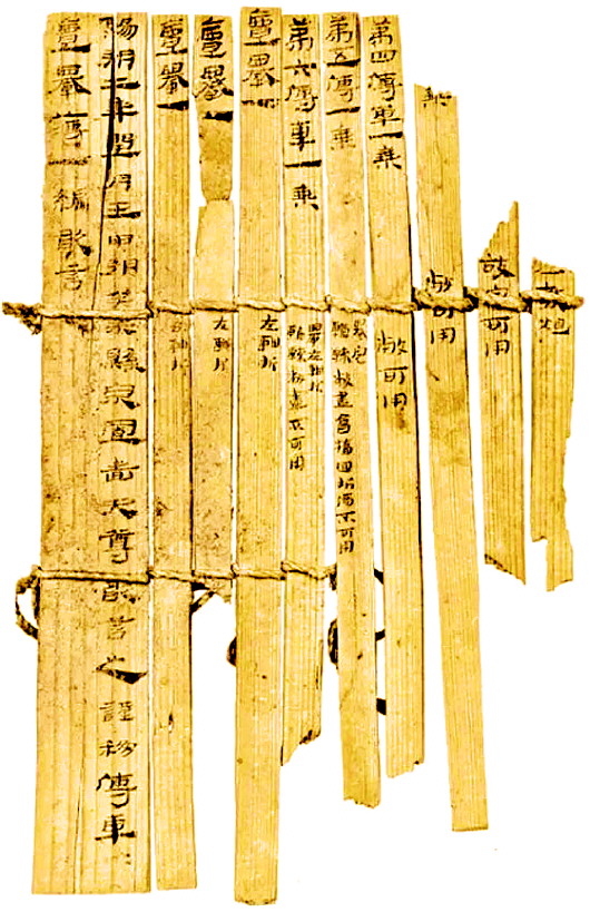 竹简大多数保存完整。从留存痕迹看,其简册有上、中、下三道纬编,每简右侧编绳处都有三角小锲口,并有编绳朽痕,系丝织物。大部分简的天地头正背两面粘有深蓝色粗布片,可能当时编册后用布包裹粘托,以作装帧。