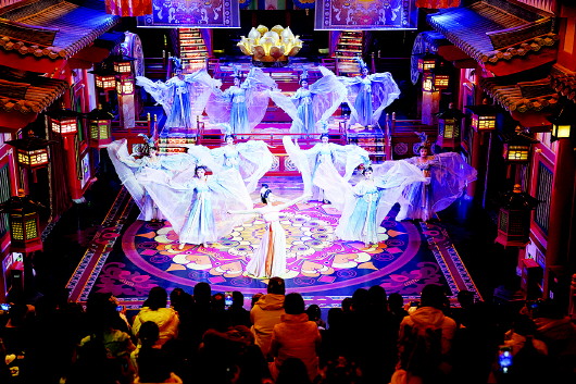 12月28日,演员在街区内表演大唐乐舞《霓裳羽衣舞》。