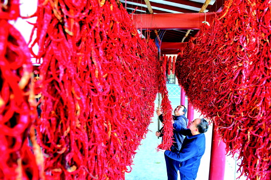 12月29日,清水县贾川乡梅江村党群服务中心的院子里,一串串色泽鲜亮的红辣椒在阳光下格外惹眼。