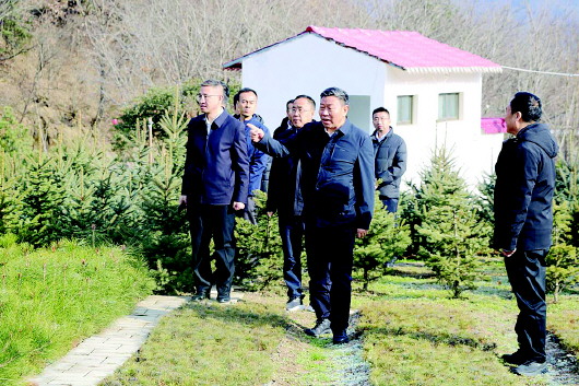 ▲甘肃省小陇山林业保护中心党委书记、主任马越垠(中)在高桥林场调研