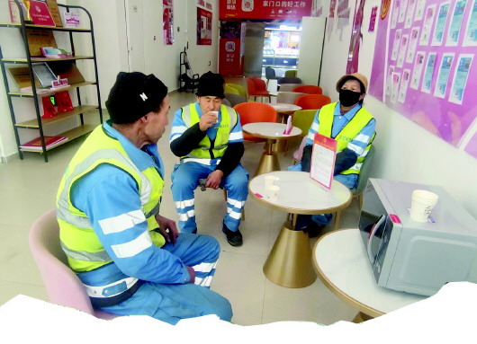 1月15日下午,透过洁净的玻璃,冬日暖阳照进秦州万达广场的工会驿站里。几名环卫工人、商场保洁和安保人员围坐在一起休息,他们有的随手翻阅书架上的书籍,有的喝水聊天,有的利用驿站里的充电宝给手机充电。与此同时,在秦州区藉河北路物流快递网点的工会驿站里,环卫工人、进城务工人员在这里喝水、热饭菜、歇脚,在说笑中缓解疲惫。