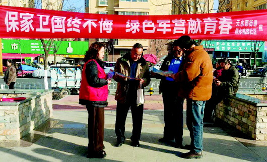 近日,秦州区天水郡街道藉水南路社区开展征兵宣传活动。社区工作人员通过悬挂宣传横幅、发放宣传资料、现场讲解动员等形式,为群众耐心解读大学生入伍学费补偿、退役升学加分、就业安置扶持等政策,进一步激发广大适龄青年的参军报国热情。 卢鹏杰 摄