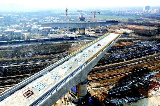 1月22日,由中铁七局承建的合武高铁塘埠口滠水特大桥跨京广铁路转体桥完成转体施工,为工程的下一步建设打下坚实基础。合武高铁是国家中长期铁路网规划的重要项目,建成后将进一步完善沿江综合交通运输体系,大幅缩短武汉至合肥的运行时间。 新华社记者 肖艺九 摄